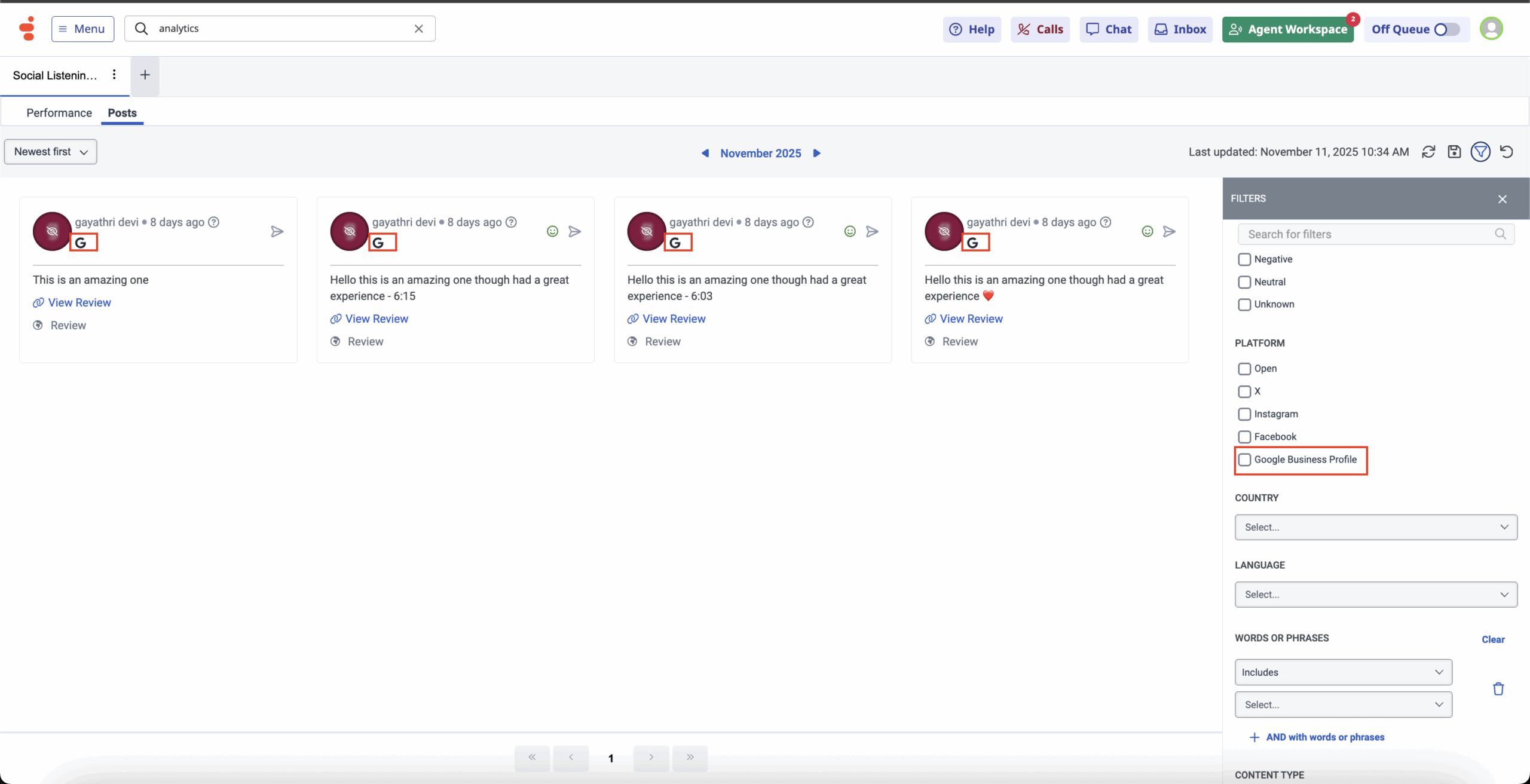 - Improved visibility – Agents can now see and manage Google Business Profile interactions in the same workspace as other social channels.