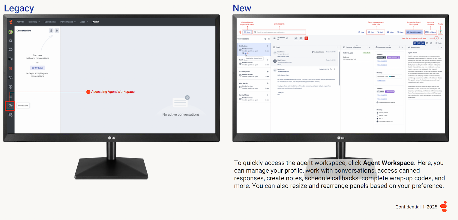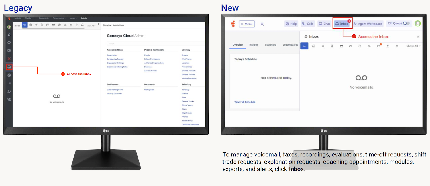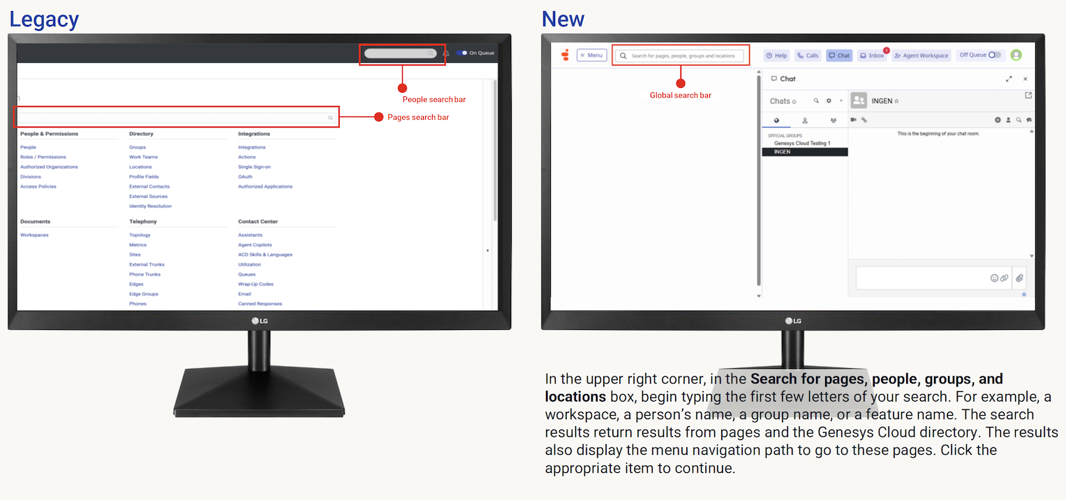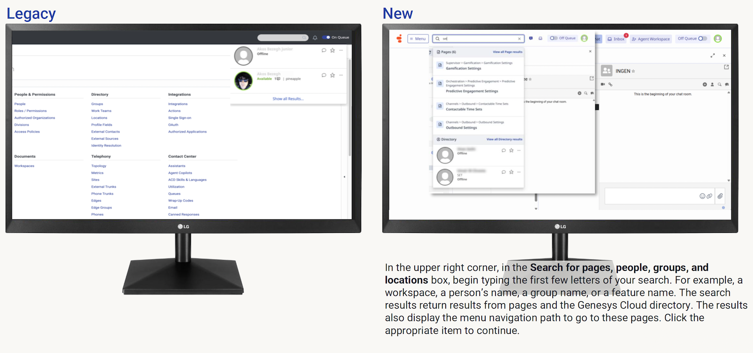 Genesys Cloud ha cambiado automáticamente a la nueva Navigation and Information Architecture como interfaz por defecto para todos los usuarios. A medida que los cambios se desplieguen por las regiones, sus usuarios dejarán de tener acceso a la vista de interfaz de usuario heredada.