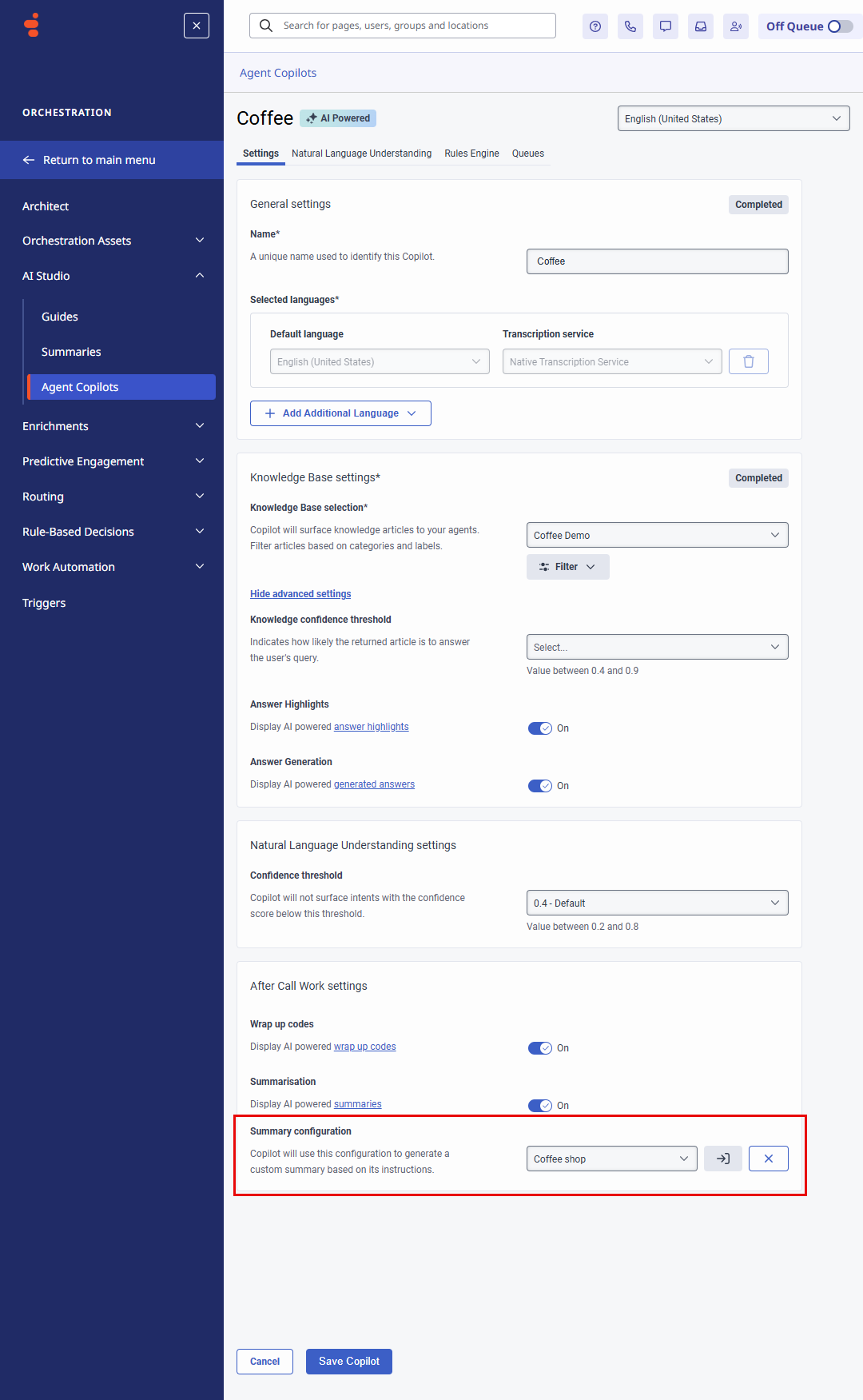 Antes de poder asignar una configuración de resumen de AI Studio a un Agente Copiloto, primero debe añadirlo en la vista de AI Studio. Para obtener más información, consulte Añadir y gestionar un resumen de AI Studio.