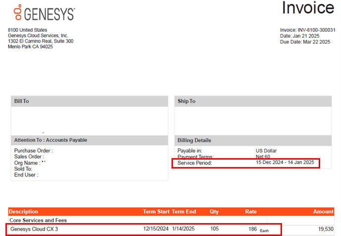 - Charges appear under standard Genesys Cloud published rates, rather than your contracted rates.