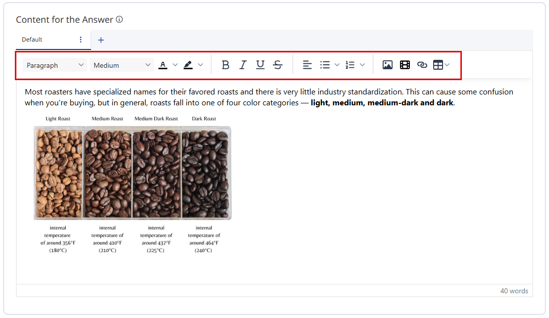 Esta sección describe cómo formatear el texto de una respuesta de conocimiento, y también cómo añadir contenido de imagen o vídeo.
