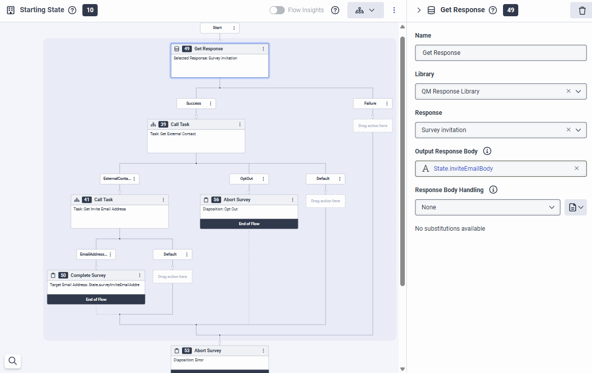 - Debajo Respuesta, seleccione el mensaje predefinido que desea agregar al flujo. En este ejemplo, la respuesta es Invitación a la encuesta.