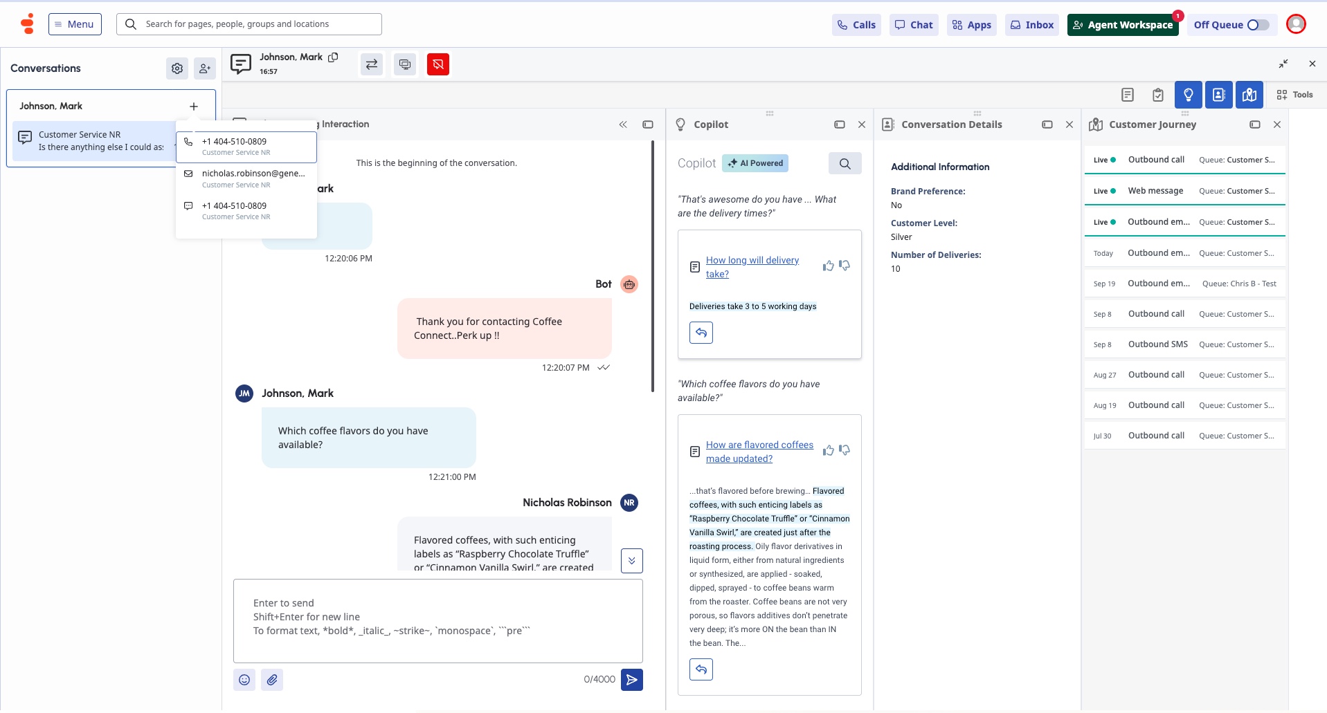 New and current interactions appear on the left side in the Conversations roster. If available, Genesys Cloud displays the division label for the conversation participant. To answer, decline, or view an interaction, select it from the list. To the upper right of the Conversation roster, the Agent Workspace shows the contact name, conversation elapsed time, interaction channel, and interaction controls at the top and the interaction content below.