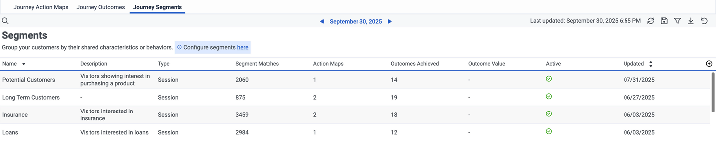 El informe de segmentos del viaje muestra el rendimiento de segmentos específicos de visitantes y lo bien que los está captando. Por ejemplo, el número de resultados obtenidos por segmentos de sesiones y segmentos de clientes.
