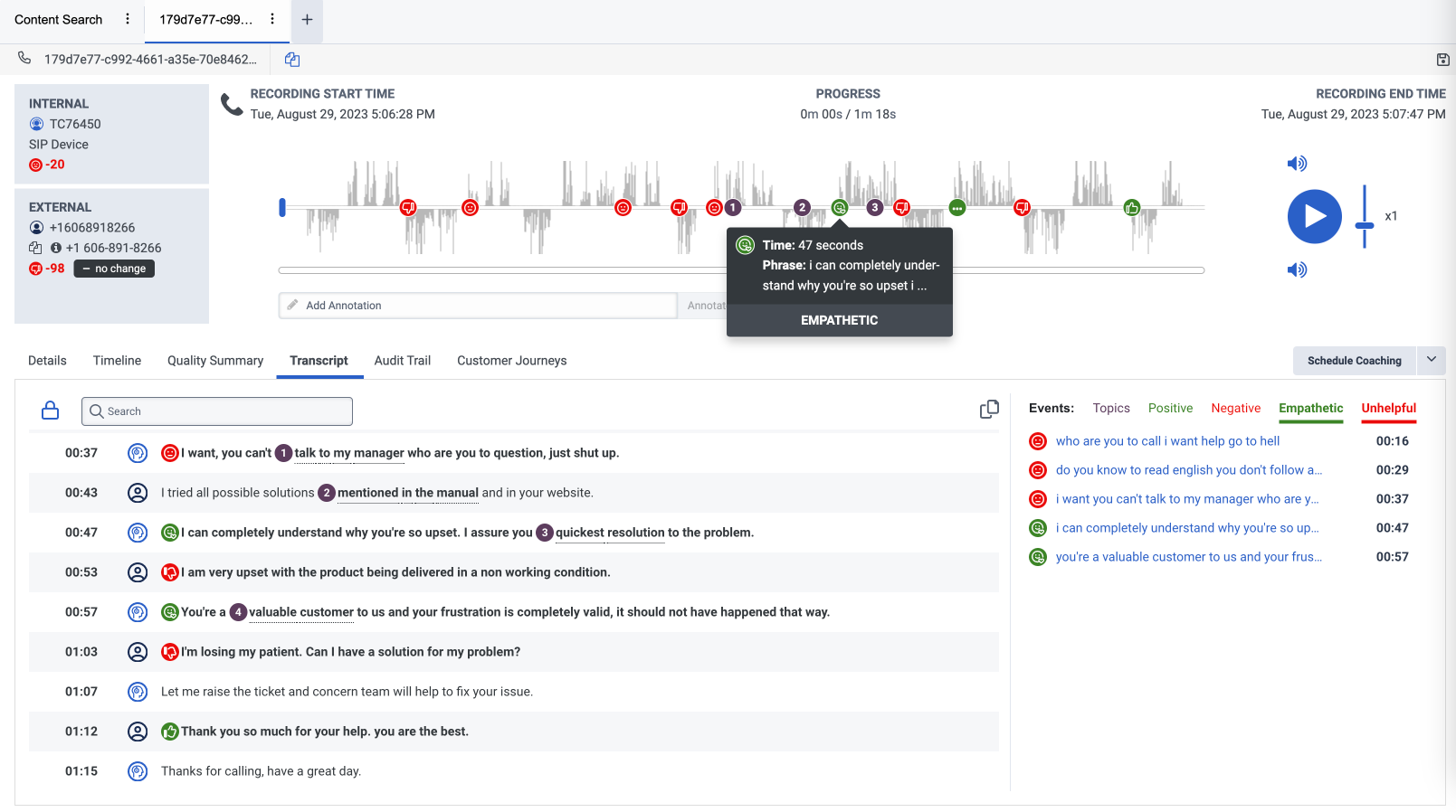 En la siguiente imagen puede ver los marcadores de análisis de empatía en la transcripción, el panel Eventos y en la forma de onda de resumen de interacciones sobre la transcripción.