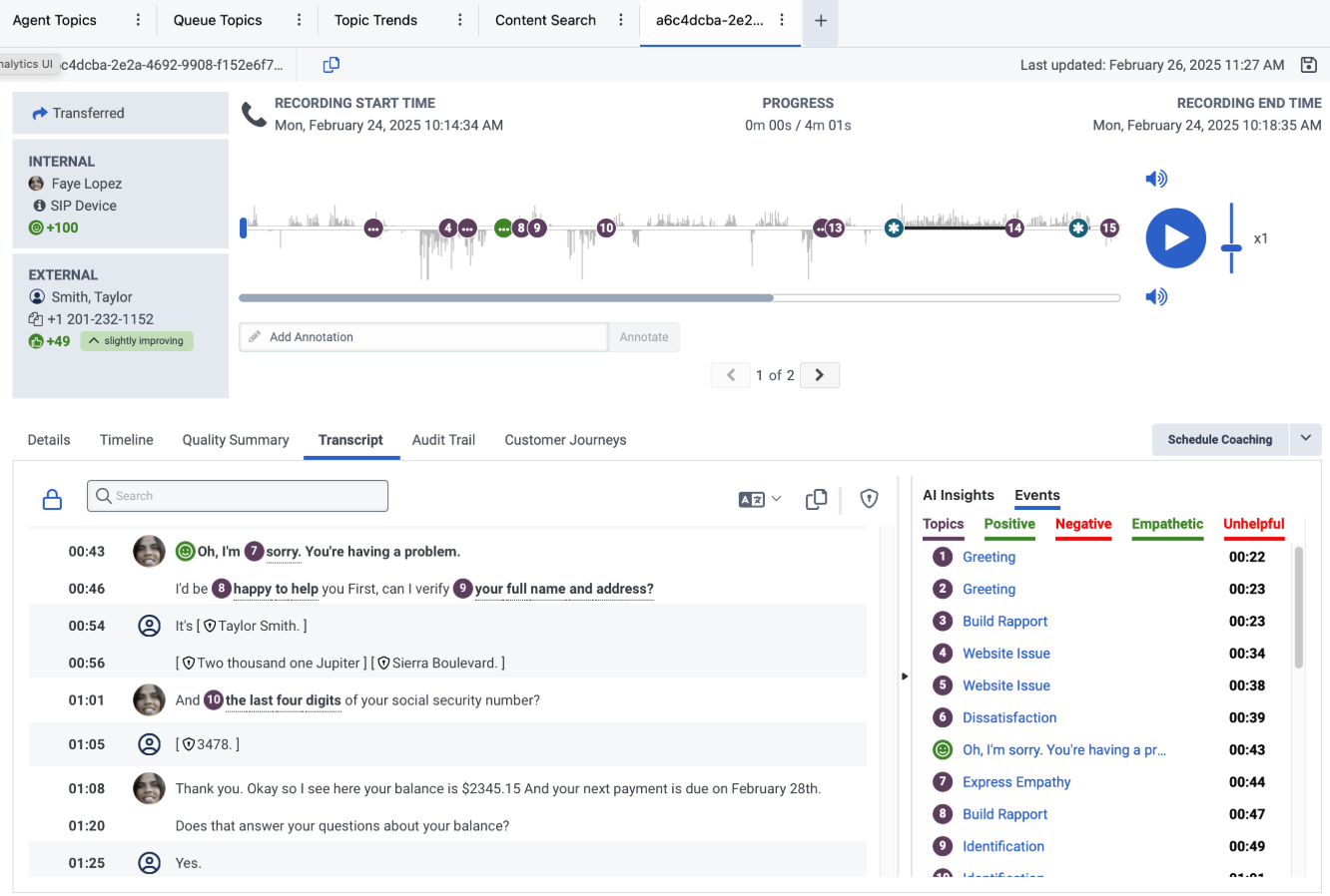 El resumen de la interacción se sincroniza con la transcripción de la interacción. Al reproducir una interacción, las palabras pronunciadas se resaltan con un fondo azul a medida que se pronuncian y la transcripción de la interacción se desplaza hacia abajo al unísono con lo que se dice.