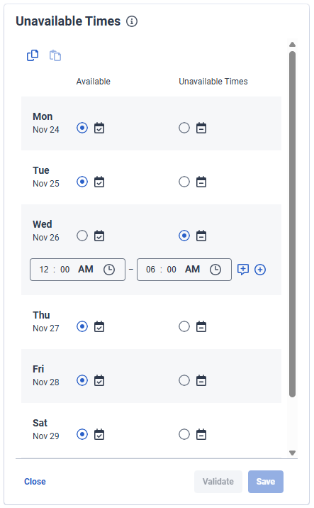 - Repita los pasos necesarios para otras fechas. Utilice el icono Copiar a otras semanas para copiar las horas no disponibles que ha introducido para la semana y utilice el icono Pegar para aplicar las mismas horas no disponibles a otras semanas. Siempre que pegue Horas No Disponibles a una semana, asegúrese de hacer clic en Guardar para que sus horas no disponibles se tengan en cuenta en la generación o reprogramación del horario. Nota: Cuando se añaden entradas de tiempo no disponible que infringen las restricciones del plan de trabajo, como las horas pagadas mínimas u otras normas de programación, aparecen advertencias para avisarle del problema. Posteriormente puede añadir o actualizar las horas no disponibles según sea necesario y WFM las guarda como Últimas guardadas en la vista del programador o del administrador. Durante la reprogramación, el programador o el administrador pueden elegir si utilizar las horas no disponibles originales o las últimas guardadas al regenerar la programación. Para obtener más información sobre cómo reprogramar las horas no disponibles, consulte la sección Reprogramar las horas no disponibles de este artículo.