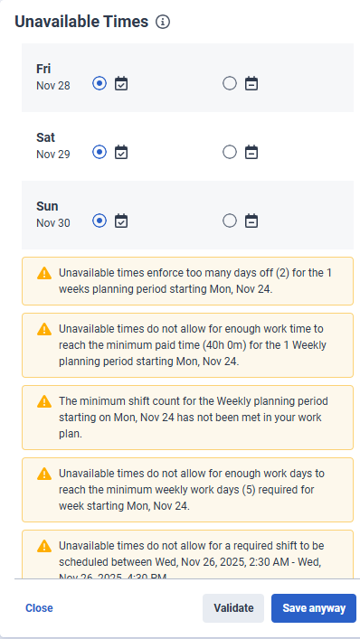 Cuando se introducen horas no disponibles y se infringen las restricciones del Plan de Trabajo, aparecen advertencias, como las horas mínimas pagadas u otras normas de programación. Esto significa que el planificador de WFM no puede asignar un turno basándose en las horas no disponibles que ha introducido. Como agente, puede revisar las horas introducidas o proceder a guardar su solicitud. A continuación, su programador puede revisarlo manualmente para ajustarlo y asegurarse de que se cumplen las horas de trabajo requeridas. Para más información, consulte la sección Mensajes de advertencia de este artículo.