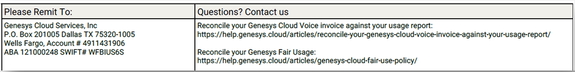 La parte inferior de su factura incluye enlaces a la Política de uso razonable de Genesys y a los recursos de facturación de Genesys Cloud. Estos artículos explican detalladamente cómo se calculan las dietas y los excesos para que pueda verificar sus gastos en cualquier momento.