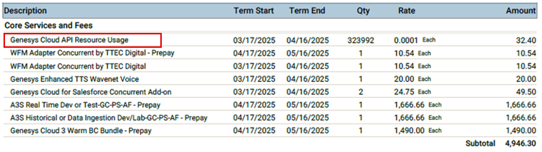 • Resource Usage: If you exceed fair use, then extra charges (API, storage, IVR, BYOC) appear under Core Services.
