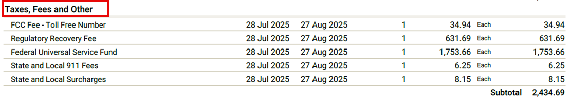 The Taxes, Fees, and Other section shows charges that government authorities, not Genesys, mandate. These charges can include: