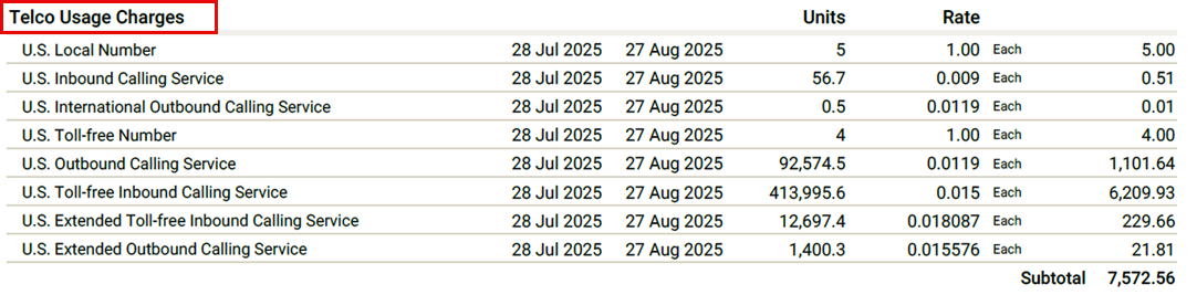The Telco Usage Charges section is always separate and only covers telephony-related usage. Examples include: